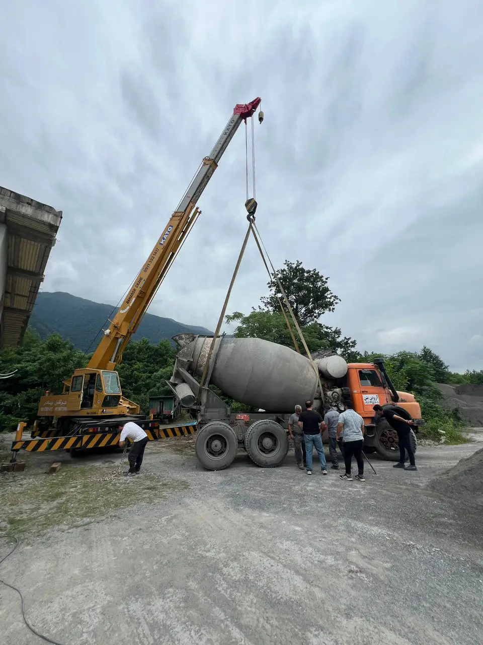 - ⚙️ پایین گذاشتن میکسر و تخلیه میلگرد با جرثقیل سنگین